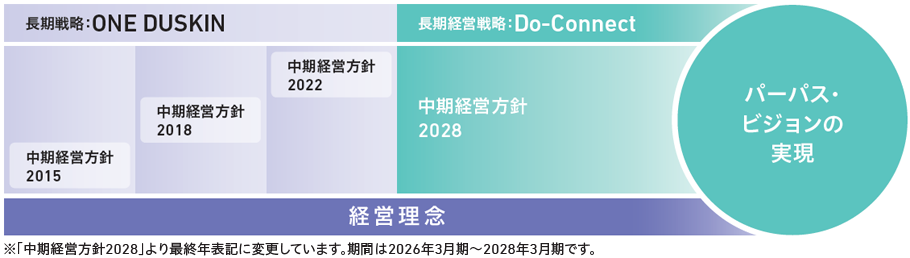 当社は、2025年3月期で10年間にわたる長期戦略「ONE DUSKIN」を終え、新たなフェーズへとシン化するために、これからの将来を見据えたパーパス(社会的存在意義)・ビジョン(担うべき役割)を策定しました。また、これらを実現するため、長期経営戦略「Do-Connect」及び2028年3月期を最終年度とする「中期経営方針2028」を策定しました。これからも全社員と全国のフランチャイズチェーン加盟店の皆様とともに、パーパスに掲げる「人に社会に寄り添い、安心と喜びのある豊かな明日の創造」を進めてまいります。